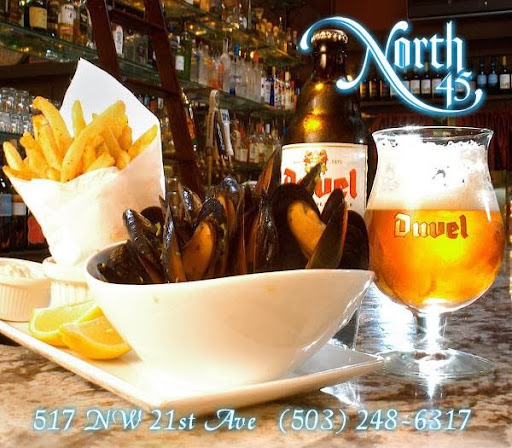 Just discovered their hidden back patio last night, after being to North 45 several times. Although the service was unfortunately disappointing, I was glad to at least enjoy the patio time with friends. The food is good for a bar, though nothing to necessarily seek out on its own. North 45 does however boast a good happy hour with several drink options (beer, wine, well, etc) and some cheaper eats that sounded pretty good - especially at that happy hour price point! The other time Id been in, sat inside for a drink with friends, so service wasnt a real issue (for leisurely hang out time). Overall: good drinks, good middle of the road prices.