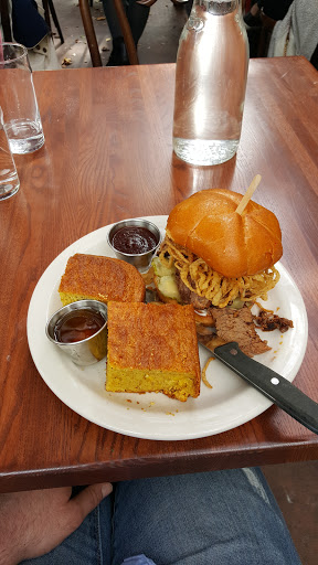 Found this place after deciding a sushi place around the corner had too long of a wait. The reviews were stellar! So we walked the 3/4 mile on over. The wait was about 30 minutes. No big deal. We were seated at a table with incredibly uncomfortable chairs. You had to sit bolt upright or forward and the whole seat had a 1" or so lip digging into our legs. I had hurt my back a few days prior (falling off a ladder). So I asked if we could be seated at a booth that was being cleaned up, and noted my back ailment. We were told no. That it disrupted their flow too much. Uh... Okay? Contrary to what you might be thinking, I did keep an open mind to having a good experience here, even if I felt like complete crap sitting in their crazy chairs. The mint julep I ordered was disgusting. Just tasted like straight alcohol. No mint or sweetness at all. Yuck. I wasnt feeling terribly hungry by the time the waiter took our order. So I shared with my husband. He got the House Smoked Beef Brisket. The meat didnt really taste like anything. Just greasy and fatty. Coleslaw was half way decent. Baked beans were spicy, & not in a good way. They tasted like they added a ton of black pepper. It was also made with ginormous white beans. Very weird. Oh my god, dont even get me started on the cornbread. It was full of vegetables and tasted like undercooked cornmeal. 2 of our friends joined us as well. Before dinner they had ordered the hush puppies. According to said friend, HPs were amazing. So we were super excited to try them. They were gross. Basically just their veggie filled, undercooked cornbread dipped in oil. So, so, so greasy. The dipping sauce was phenomenal though. The wife of the couple we had with us, had asked lots of questions about her dish, because she is very sensitive to spicy foods. She was assured there wouldnt be anything spicy on her plate... Almost all of it was. The atmosphere in this place was INSANE. So loud and crowded. You couldnt even here the waiter unless he yelled. We also had to yell to be heard. You couldnt move in any direction without bumping into someone. This is a sit down place and sitting down there was just awful. Bottom line: You couldnt pay me to go to this place again.