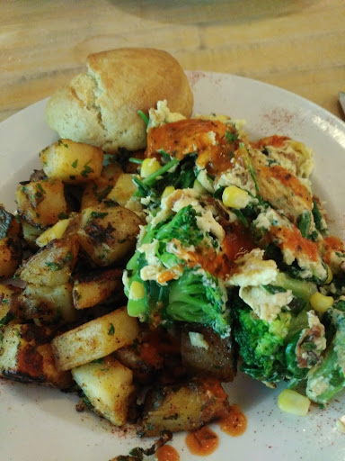 I live near this cafe, so Im lucky enough to be able to walk here on my mornings off. The food is always tasty and theres plenty of seating. The back patio is usually pretty quiet on weekdays. I love all the vegetarian options. I usually sub any of the meat with their vegetarian sausage and its perfect.