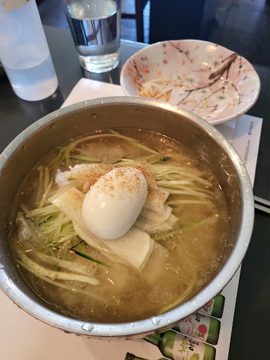 Air conditioning cranked up. Too cold to find any comfort at the table. Soup was very bland. Salt might help. Two tiny pieces of chicken in a $10.00 bowl with noodles. Overpriced and poor quality. Meat with rice also not flavored. Waitress found some soy and chili sauce and salt to add flavor. Less than 1/8 cup beef, 2 slices of zucchini, and 1/8 cup of slices carrots cost $13.95. The tea was clear and tasted like water. Dont waste your money on this restaurant. Korean food should be a wonderful delight, unless this was perhaps a North Korean restaurant. In which case, carry on.