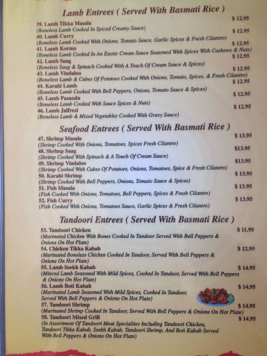 Best Indian food anywhere! No other places compare. Ive been coming here for years now and will never change. My favorite is chicken tikka masala, always order extra because there wont be any left overs for the next day, and youll want them! Wonderful service, love the sweet ladies that work there. Tip: excellent food takes a while to prepare so I like to call and order ahead. Happy dining!