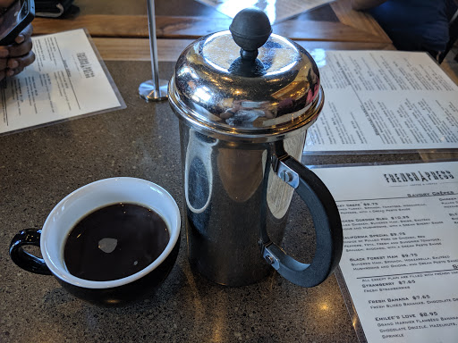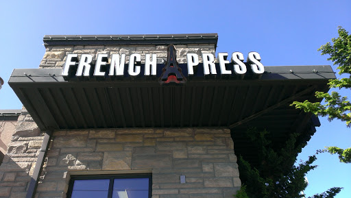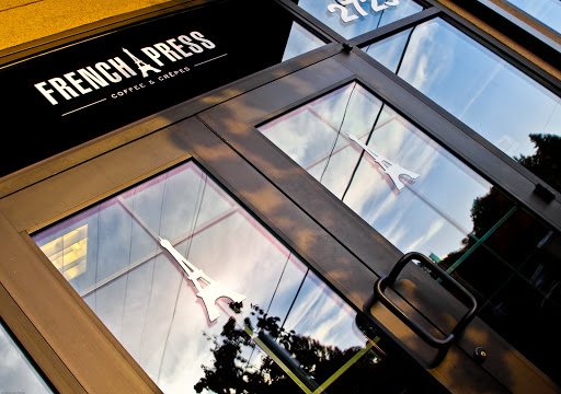 My wife and I visited French Press for the first time today, and were very impressed. It is the perfect little café. The premises is somewhat similar in style to Starbucks, but without all the merchandise cluttering up the place. The architecture has a lot of natural materials that give it a sophisticated atmosphere. The menu was very well organized, with clear categories on the crepés that made it easy to find one that you liked. We were surprised at the low prices for the crepés ($5 for breakfast & sweet crepés, $8 for savory), which are large and just filling enough. The ingredients are high quality and fresh, and the crepes are served in an attractive manner. We did not try their coffee, but there seemed to be a large selection of choices and prices were quite reasonable. The only thing that I did not like was that the menu could not be easily read except when one is right at the register. It would be nice if there was a rack with printed menus available so that one could make up their mind a bit before they order. Overall, it was a wonderful experience. High-quality dining at very reasonable prices. A new favorite!