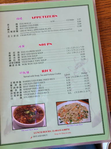 My wife and I have eaten here three times. As the closest Chinese restaurant to where we live, the location has been what kept us coming back. Each visit, the food has been more disappointing. Our last visit was very disappointing between the quality of food, what we got for our money and the service. My wife asked how much to add broccoli to her Orange Chicken plate, the waitress said this could not be done. My wife then asked how much for a side order of plain steamed broccoli, the waitress said they could only make a full order of broccoli which would cost $9.00. Needless to say we did not purchase the broccoli. Once home we began consuming our meals, my wife with the Orange Chicken and myself with Mar Far Chicken. The Orange Chicken was not completely cooked. On multiple pieces, the fried breading was still very doughy on the inside resulting in a soggy texture and gross taste. The Mar Far Chicken was unlike any Mar Far Chicken I have ever consumed. It was roughly 87% breading with 13% chicken, and even with this poor chicken to bread ratio, the breading was over cooked and the snippets of chicken within were dry. If I talk about the rice, I may seem to be complaining too much. Ill just leave it as disappointing too due to lack of flavor and vegetables which are normally part of what I consider Fried Rice. I honestly feel we would have got better food at half the cost at the Safeway Deli, or even frozen section. We give Great Wall an extra star simply due to the helpfulness of the waitress/owner. Each visit here, the restaurant is vacant, Im unsure if the downturn in their food is an indication of how their business is doing, if so I am saddened because my wife and I liked this place on our first visit, but may have been driven away permanently on the last visit.
