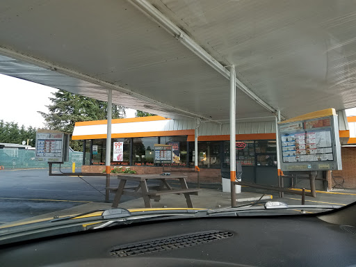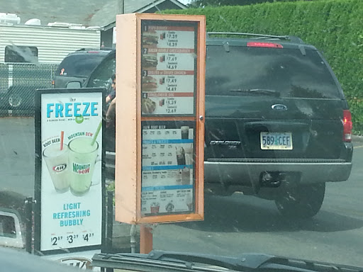 This is one of the last two A&W drive-ins in Oregon (the other is in Sweet Home) where you can still park and order from your car. That said, we usually eat inside in one of the large booths in the back. From the inside booths you place your order via an intercom phone. Our kids love the place, especially in warm weather as there is an outdoor play area out back. A negative are the single-occupancy restrooms - you can be in for a wait when the restaurant is full. The menu is large with choices that include burgers, chicken sandwiches, hot dogs and a large selection of various ice cream desserts and smoothies. Currently they serve all-you-can-eat shrimp dinner on Fridays and breakfast is served daily. We placed our usual family order: Five Jr. Bacon Cheeseburger combination meals, which is an ongoing "special" that includes a burger, fries and a drink for $3.99. We like to substitute for the drinks by ordering milkshakes, freezes, smoothies, etc. As usual, the service and food was good. The burgers are not gourmet - I would say they are most similar to what you find at Dairy Queen. This is our favorite area fast food restaurant as visiting is just a good experience for the family.