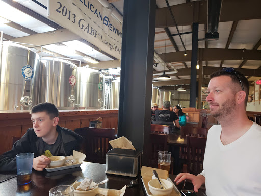 The beer was good and the prices were pretty normal for a brew pub. The food was pretty good but I feel like the cost is pretty expensive especially considering you are in a remote city and dont have to pay the high rent of being in a large city (or even coastal tourist town), you order, pick up, and bus your own food and dishes (read: metal platter) as well. Food service is walk up, order, and take a pager device. I sat inside and it was pretty loud as they were brewing and/or cleaning out the tanks inside the building, it was rather annoying and doesnt make for a pleasant eating experience. I was relieved to rush eating my meal and get back outside where it was much quieter. It would be nice if they at least had a Plexiglas wall to buffer the dining room from the brewery. They have a couple televisions which can be convenient for those occasional sports games, there is outdoor seating in the front, however there is no wireless internet so dont expect to connect if you go here. Id say larger groups could be accommodated here if you get creative and dont need everybody sitting together.
