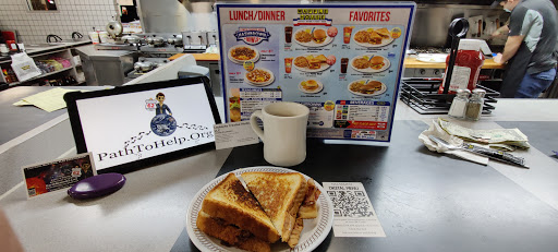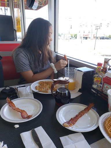 This chain must have been invented for drunk and high college kids. When an establishments sign looks like it was composed with ransom letters, you may want to avoid it. The place smells like smoke, the waffles are dry, the syrup is missing most often. And the place is DIRTY. Beware