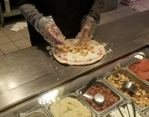 If youre looking for a good slice, you wont find it here. The pizza tastes alright, but between the machine that flattens the dough to the tiny pass through oven it felt like a college dining hall that is trying way to hard to make up for the fact that they dont sell large pies or make real pizza. Of the "pizza places" on the main line, this is one to miss.