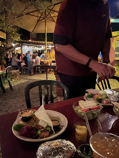 Went there with big group after enjoying zipline. Was never there b4. Menu sign was hard to read, bc chaulk was light on menu board, and bright sun made it very hard to read. Also several meats/kabobs in case were hard to distinguish bc covered in sauce. Didnt know what meat/what sauce was. After seeing what friends ordered/what was on their plates, I was finally able to order. W/out asking them it would have been much more confusing to order. If I had been there sev times, would be easier to order I think. But as newbie it was confusing. Cooked food while bbq area was really crowded and had to wait for tongs sev times. Sat down at table and enjoyed my meal. Server was very attentive. We never waited long for drinks. Had one ready b4 we finished last few gulps. Great! He was very fast at cleaning up used plates/cups and wiping table down. Exellent server couldnt ask for better and there was 8 at table so we kept him busy, along w his other tables. He was on top of it whole time. Had a great experience there. Would recommend to others.