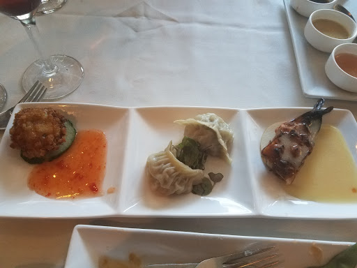 We hated this place. The ambience seemed nice at first. But it was a little dark with small spotlights that point to odd places around the table instead of, say, where the menu and food go. Then we noticed the flatware was dirty. The wonton soup was standard fare broth with two small wontons and a few shreds of undercooked vegetables. The coconut shrimp soup had one shrimp and so much curry (not spicy hot) that no other flavors were discernible. The spare ribs (four) were small, with very little meat, and completely burnt sauce. The seafood dumplings were flavorless and served in hot oil, which is spicy but does nothing to give any flavor. The mango chicken entrée was so-so. The mustard coconut shrimp entrée was appetizer-sized; it seemed like the coconut was an afterthought, as if the shrimp had been cooked and then rolled in a few strands of coconut. We were given a small cup of rice for five people. No tea or noodles or anything. The waiter rarely came to our table, pretty much only to bring what we ordered, and never asked us how we were enjoying everything or if we wanted anything else after the initial order. This was our first time here. We had intended to order more after the first round, but were so dissatisfied with the food and service that we left hungry and ate elsewhere later.