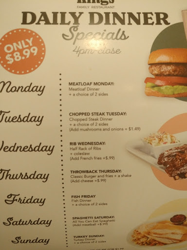 We used to love going to KINGS FAMILY RESTAURANTS for dinner, but as THE RAVEN quoted, "NEVERMORE". Simply said, BAD SERVICE, BAD FOOD, BAD TIMING (as in too damned long to eat) BAD EXPERIENCE!