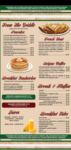 We went there for breakfast after church yesterday, the portions were huge and very tasty. I had a mushroom omelet that I brought 1/2 of it home and my husband had their cream chipped beef. Great service and very fast. We picked up a peanut butter pie for dessert for our Sunday family dinner. It was really good.