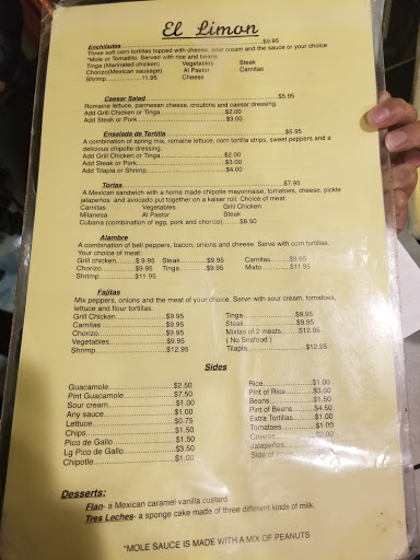 I love El Limon. It is my go to mexican restaurant. When I have friends come to town, I take them to El Limon. Ive tried most of their foods and at this point I stick mostly with the loaded nachos and enchiladas with mole. Personally I find the flavors of the enchiladas are the best with the vegetarian option as it has a lot of variety of vegetables and really creates a complex flavor profile. The mole, is the best I have ever tried and nothing comes close to what you get at El Limon. Sometimes, the quality isnt as good as other times but I have never been disappointed. They have a nice tres leches for dessert if you arent full at the end of your meal. An added bonus is the margaritas which arent on the menu so you have to ask for them and they are free!!!