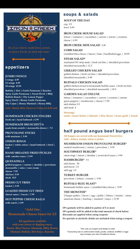 Iron Creek is a great place to go for a drink, or to grab some awesome food. I like to go particularly on Tuesdays because the owner works on the bar that night. Hes always taken great care of me and takes time to create conversation with the patrons. Isnt that why we all choose a place to frequent?! There is no better feeling when you sit down and dont have to say a word, but your favorite meal or drink is just put down in front of you. The tacos are great, and my personal favorite is the Chicken Rancher in a wrap. They also have a great cheese sauce that is home made and its crazy addicting! The atmosphere is great, and has that small hometown feel, kinda like a "Cheers bar" but in little old Cuddy, PA. Ive gone here for just a drink and Ive also brought groups after softball games and they have always accommodated us. Iron Creek also gives back to the community and sponsors softball and baseball teams, along with participating in fundraising, most recently a spaghetti dinner for a woman with children who lost their home to a fire. I love the customer appreciation day and holiday parties each year too! You can always count on an event going on to make plans to attend whether dressing up for Halloween or ringing in the new year. Id rather spend my hard earned money at a place where I am made to feel important and appreciated rather than a chain restaurant where Im just another butt in a seat any day and recommend this place to every and anyone. Great service. Great food. Dont just take my word for it, check out Iron Creek!
