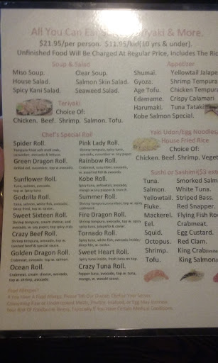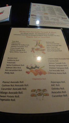 New management. New menu. An all you can eat sushi, teriyaki, rice, appatizer option that includes special rolls. Very good selection and quality.