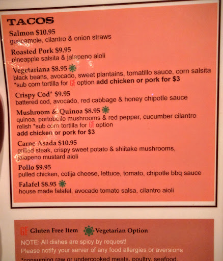 First, got seated at a cramped table set too close to others. Moved to the bar. Watched two other couples that sat at the bar after us get their chips and salsa before us. First round of margaritas was good, second round was aweful. Had to send them back. Main meal came out before our appetizers (appetizer order was placed 10 Minutes before entrees) was told it was parents weekend and they were busy, this is why our meal was out of order. Watched our entrees sit out while we waited for our appetizers. Wondered if our meal was just going to be microwaved and sent back out. Bar tender was apologetic, as well as manager. They did refund margaritas and give us appies for free. But overall experience was poor .... Advice: Ditch the "atmosphere" and hipster vibe and go down the road to LaPerla and get real home made Mexican.