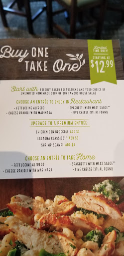 We love the unlimited Salad and bread sticks and the fresh tasting main dishes. We have tried several of their new dishes and have enjoyed them all. The wait staff is friendly and helpful. We appreciate all the good food that is reasonably priced and well presented.