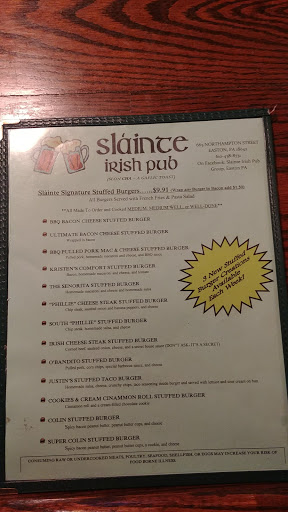 I have been going to Slainte for years. Hands down they have the best food. Their chips are amazing, and their burgers are to die for. However, the first time I went there the bartender would not let me get anything BUT a stuffed burger, which I thought was rude. There burgers are GOOD but I should be able to choose what I want. There beer selection is so so. You have to wait a long time for your burger ( or any food) because there is only one cook. (Although she is amazing). Its a nice small quiet space. A little expensive, and the bartender is a little cocky. She is always saying how amazing her burger is but Ive had some bad ones too. She loves to get into conversation, but like I said she is somewhat cocky and very sarcastic. Their burgers are almost 10 dollars which is expensive and would be worth it if the service was faster and the bartender was nicer.