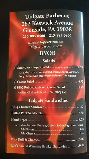 I cant believe no one has written a review about Tailgate Barbecue! We ate there before a show at the Keswick Theater. I had the Pulled Pork platter with baked beans and mac and cheese. Everything was excellent! The portions were generous, service was prompt and the staff was very friendly. I loved the casual atmosphere and the homemade snacks. I had the crumb cake which was also delicious. I will definitely eat there again!
