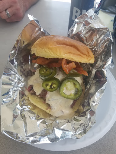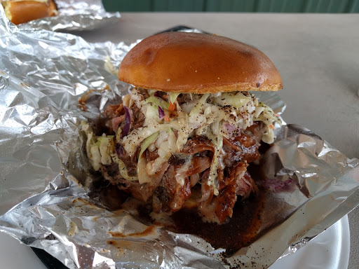 My wife and I shared their Tres Hombres sandwich. This sandwich is huge and Im someone who can really throw down. The fries are great, really good consistency and not too greasy, the coleslaw is good and their bacon is incredible, the biggest problem I had was the pulled pork, it was not even warm or well seasoned. You can taste that it has a good smoked flavor but it really needs a bit more seasoning. The spicy sauce is pretty good, but the sweet is bland. The smoked sausage is very good and not dry. Overall I left satisfied and had a good experience, definitely worth trying.