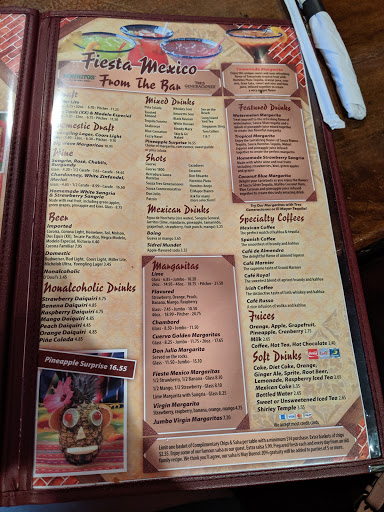 My brother, sister-in-law and I were actually looking for another restaurant when we happened upon Fiesta Mexico. We took a chance and were all so glad we did. The decor was somewhat like the lovely Hotel Hershey at the entrance to its restaurant, but that was the only similarity. When I dine at a foreign-style restaurant I much prefer that it typifies the country whose cuisine they serve, not only with their menu, but also with the ambiance and the dinner music. Fiesta Mexico has it all. My sister-in-law was delighted to find that all we met on the staff spoke Spanish, which is also her native language. This was more than what we would ordinarily pay for lunch, but it was well worth it when all factors are considered. We had ordered different menu items and we found each enjoyable. The amount of food was neither too much nor too little.