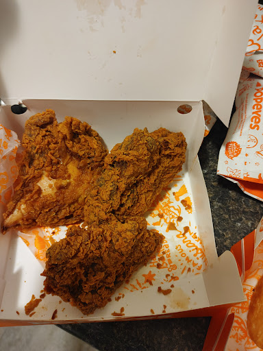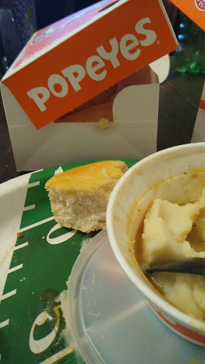 Just a typical Popeyes. The fried chicken wasnt freshly fried. It was sitting there for a while. It didnt taste bad but it didnt taste great either. Just average fried chicken. I have had better Popeyes chxn at other locations. Cleanliness was average. The ladies bathroom was adequately clean, not amazing but good enough, meaning floors were free of trash. There was a light out in the bathroom which made it darker than it should be. The lock on the door kept getting stuck. The soap dispenser was broken and looked like it would fall off the wall. Dining area could use a quick wipe down of crumbs off the tables but it was trashfree. The manager gave one of the regular customers a free cheesecake on his bday, which was nice. Though Im not sure how to react to an employee meeting occurring in the dining area, where an employee was reprimanded for her actions regarding a customer complaint at the drive thru. I would think it best to have that meeting elsewhere away from customers.