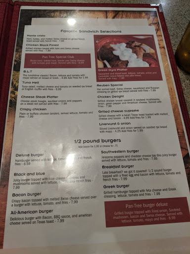 Ever hear the song you can get anything you want at Alices restaurant? Well the same holds true for the Pan Tree. For a small place, they cater to your dietary needs as well as picky palate. Hot food is served hot, cold food is served cold and they arent stingy with the coffee. On the average Im there twice a week for breakfast and have brought many satisfied friends. My favorite dinner there is the meatloaf.