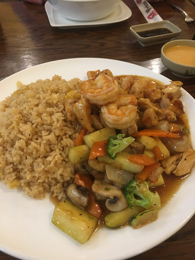 A group of us went to eat here I give it 1 star for entertainment... We say at thee hibachi bar table some of us ordered rice and streak or rice and chicken well first off we got a tiny tiny bowl of broth there so called soup I think it had a leaf in it then we got a tiny tiny salad with some funky dressing on it that no one liked then a piece of shrimp as a appetizer them the main course first the chef cooked all the rice up put it on everyoned plate where it sat for 5-to 10 minutes getting cold until the steak and chicken was done then he finally put the meat on the ice cold rice yuk yuk yuk