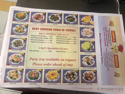 If you want to get Chinese food in Hellertown, youre either going here or to New Star next to the Hellertown Diner. Each has its benefits. If youre looking at the building itself, China Moon is slightly cleaner inside, though both are more of a take out place than sit and eat. The difference is speed: Where I had to wait nearly 25 minutes for my food at China Moon (Pork Lo Mein and two eggrolls) the same order at New Star had me in and out in a little under 7 minutes. Both orders were walk ins mind, I didnt call ahead. Quality wise, its tough to tell, but New Star was a little less greasy, but I think the noodles were better from China Moon.