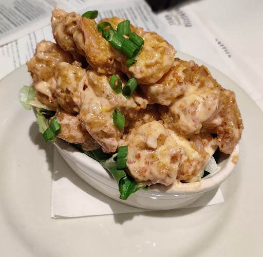 I wont be back... I had previously eaten at this Bonefish location soon after it opened. It was average at best. I went back on Wednesday night with a party of 6. We were promptly seated for our 7 oclock reservation. When we opened our napkins and took out our silverware, three of us had received dirty utensils. I dont mean that they had stains from the wash on them, they had actual chunks of food on them. We really should have just walked out then. Our server, who was friendly, told us that bang bang shrimp is half price on Wednesday, so we ordered three orders. They came out very quickly. They were good, and reasonable at half price, but I would not pay $12 for a regular order. I can make them at home myself for half of that. An hour after our Bang bang shrimp had finished, we inquired as to where our food was. We were told it was being plated. 10 minutes later our entrees came out. 2 minutes after that, our salads came out. As far as I know, salad usually comes before the entree. My shrimp and scallops were undercooked, and did not have their lemon butter sauce. Not only that, but $20 for 2 scallops and 4 shrimp is absurd. When my reheated entree came back out it was still missing its sauce. I was not going away any longer. So I ate the tiny meal. The mashed potatoes that came with it tasted like they were from powdered potatoes with some added water and cardboard. The alleged potato au gratin that also came with it was worse than Stouffers cheddar potato bake. One person in my party found her fish to be dry and tasteless, while others said that the tiny crab cakes were not nearly as good as they are at the local diner. The restaurant only has one beer on draft. There is no Wi-Fi. Service was subpar overall. No manager ever came over to our table, despite the fact that we requested to speak to one. All six of us agree that we should have gone to a different chain seafood restaurant down the street, where we would have had a bigger better meal for less money, and with better service. There are so many better options at the King of Prussia Mall. Between the dirty silverware, the mediocre service, and the bad food, I think its clear why I will not be back.