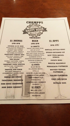 Champps is a very average sports bar with a very average menu and service to match. Its quick, convenient, and my go to when I want to grab a burger and a beer before seeing a nearby movie. If youre looking for a nice place to sit and have a good dinner out and the restaurant will be the focal point of your evening, you can do better.