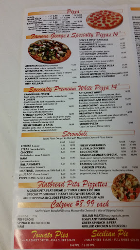 I have been getting our pizza at this pizzeria for years and the quality, courtesy, and professionalism are consistently apparent! Their food tastes great and everything is done to perfection! I highly recommend Famous Georges Pizza!