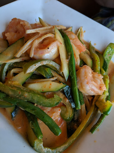 Ordered a Thai curry: Hot, but without the blend of subtle flavors I expect from Thai dishes; the pieces of chicken were thin, but very large - not good when all you have is a fork and spoon; some of the chicken tasted a little gummy. The vegetable were first rate. The Thai iced tea was OK. And quite a bit overpriced for that level of mediocrity.