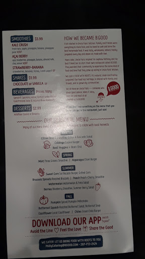 b.good has become my go to place to eat when feeling the urge to "eat healthy" it proves you dont have to give up taste to do that! Staff is phenomenal, choices are amazing - favorite is roasted butternut squash salad, go crazy get sweet potato fries and roasted Brussels sprouts SO GOOD. Get their app and join - new gifts appear ALL the time it seems I have tried catering service too- also AWESOME