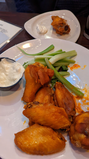 Best spicy Asian wings and blue cheese slaw ever. Steaks are heat along with string onion rings