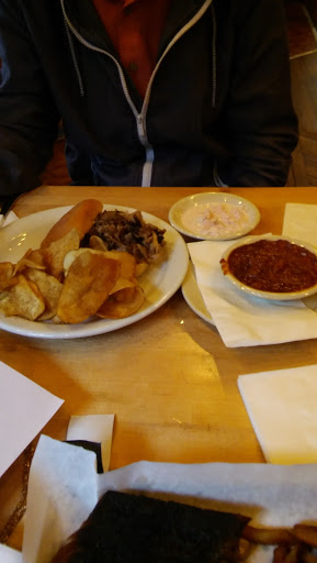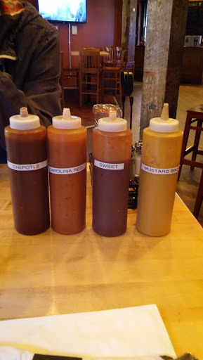 The atmosphere is nice, its an old-industrial/warehouse building thats been renovated. The menu selection is decent, although they STOPPED serving cornbread. :( The meat choices are decent. The meat came out on a try and was a little dry. The sauce choices are good, the Carolina red was my favorite. All in all, decent place for a quick bite. The three is because the waitress/bartender provided less than good service.