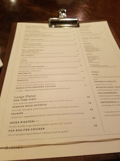 The building is recently renovated and the interior is nice enough. We were disappointed though and wont be going back. If you are there for the drinks, you might be happy because that seems to be their focus but we werent. The menu is one page (and somewhat hard to read) with the back listing cocktails. Youre also given a large draft menu and another menu for wine. We found the food menu a little humorous - how they could turn "Tacos", "Mac & Cheese", etc into something odd. My wife ordered a cup of soup (5$) which was OK she said, and a mixed greens salad w root vegetables ($9). It looked like a large bowl of parsnip sprigs. Not sure how that was "mixed" greens. We tried to identify the few chunks of something else, thinking some may have been red potato and we couldnt identify the other. I ordered what seemed the safest - brisket with gnocchi ($15). The brisket was fairly tasty but a little dry to chew. I saw another guy gnawing on his as well. I gave some to my wife so she wouldnt starve. Also, while I like blue-cheese, it was too much and too strong in a soggy gnocchi. We left somewhat hungry. It also seemed the waitress was a little irritated that we werent ordering anything else when it came time to pay. For $36 with tax and tip we were not impressed.