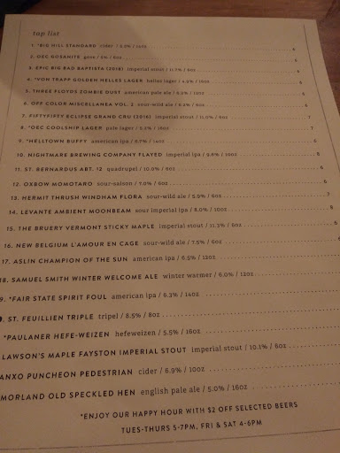 Tonight (Thursday) was oyster night. I was actually there for the featured hard ciders (which were beautifully written-up on a special menu for the evening). I tried three different ciders (with helpful suggestions from our knowledgeable waitress Kalli) to accompany my two appetizers; octopus and rabbit. Outstanding, creative menu. The dessert options were equally imaginative (I had the olive oil pastry - sounds weird until you realize we think nothing of eating butter pastry). Everything was delicious and attractively presented. This restaurant holds its own against any popular eatery in a major city. (But, please, dont go there! If too many people find out I wont be able to get a table anymore.)