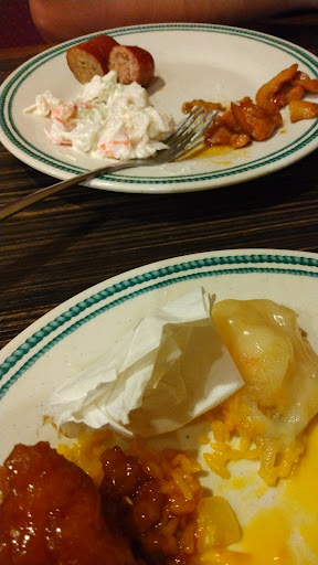 Good selection of food. The only problem is, when the waitresses (this has happened with several different waitresses) give you your bill, they wait right then and there for you to get your payment out of your wallet. I feel rushed and like they are breathing down my back while I try to get my card out. And then, when they return with your processed receipt, they will wait in front of your table again and look at the tip you are leaving and signature. Im not sure, but this seemed a little rude to me. Also, Ive been hit with food carts in the buffet multiple times by the servers who seem to not care if theyre going to run you over.