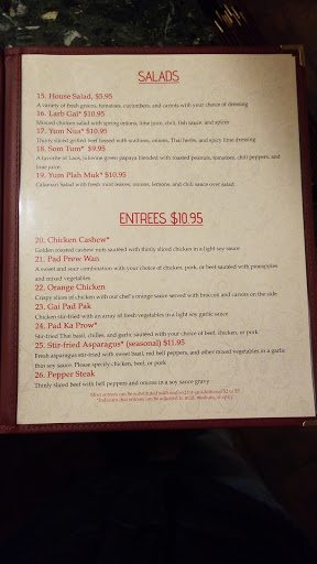 Food is delicious and inexpensive. This is my 10th time. Chicken and cheese wontons, calamari and Thai chilli wings are my favorite appetizers. Dessert I love the fried bananas and ice cream. All entrees are amazing.