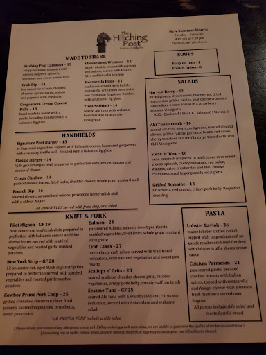 Extremely disappointed tonight. My husband has been ill for a few months and now that he is feeling better we ordered from one of our favorite restaurants but what a surprise. Ok, we did take out but everything was dry. Had the chicken pecan which was more pecans and Brie cheese than chicken. Mashed potatoes were Ok but the veggies had absolutely NO flavor. Chicken in the Piccata was almost done and these was no sauce on the pasta. The spinach artichoke dip was more cheese than anything. In our 5 month absence from eating here we noticed the menu had not changed, in fact some items were gone from the menu. Not to mention when I called in our order I was told 15-20 minutes (takes us longer to drive there) and I had to wait more than 10 mins then Aphasia to ask for my order, Bartender was more interested in counting her tips , which included our tip, then worrying whether we got our take out order. I really have a problem going back to restaurants that I consider extremely poor and tonight the Hitching Post fits that bill.