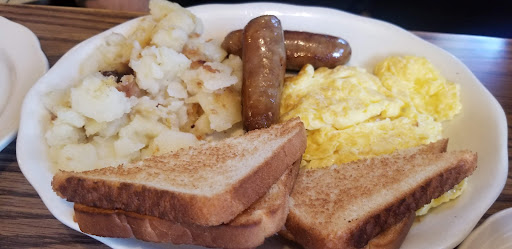 Food is really pretty good. Not too many options for vegetarians when vacationing out here and they have several. Breakfast is good personal pizzas tasty and you can sub a veggie burger for any hamburger option. HOWEVER... service is insanely slow. Dinner took 45 min to arrive and breakfast our next day took a little over an hour. Completely crazy. Also... I guess were just not in jersey anymore so life is DIFFERENT out here but the stares from old bigots as I dined with my interracial family were alarming. I know it was pretty obvious we werent from round these parts, but the majority of the restaurant stared as if they had never seen black folk in their lives. Disturbing. We took the high road and chose to make silly faces at them and giggle bUT its really quite infuriating. In summary.. only eat here if your Caucasian country folk and if your willing to wait a good hour for your meal.