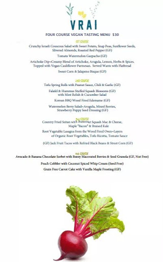 My husband and I are vegan and have a difficult time finding restaurants with vegan options so we were really excited when we found Vrai! We had the vegan ala vodka and vegetable lasagna and both were awesome. The dessert was good, too. Danielle was super knowledgeable about veganism and what we could and could not eat on their menu. She was amazing. We will definitely be back!