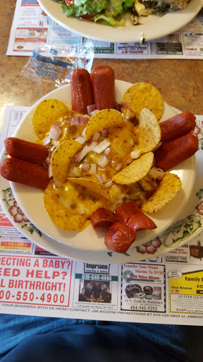 My wife and I went in on 8/3/13 for lunch. Weve never been here before and wont return. Im not a fan of large menus and this place has a really large menu. My Chili over rice platter was okay, just okay. My wifes dish was really bad. She ordered the potato skins with cheese & bacon. The 4 potatoes appeared to be gutted...meaning halved with no middle; the cheese was that cheese sauce, not real cheese and it was over loaded (drowning) with it. The bacon...ha-ha...it looked like last weeks bacon nuked in the microwave for 45 seconds...way over cooked and almost a black color...did not taste good either. The atmosphere was old fashioned, yes it is an old diner, I get it, but the leaky rook right near the checkout line, ceiling tiles that were old and dirty, and TVs around the diner do not show me that the kitchen can turn quality food around in a timely manner. Our order took 20 minutes...for chili, soup, and potato skins. Overall 2 of 5 stars. 2 only b/c my chili was just "okay".