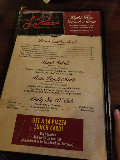 I have dined at La Piazza a number of times and had nothing but the best service. All the wait staff, as well as, the owners are very polite and always making sure that my meal and time spent there are enjoyable and worth my time and money. I love the pizza, esp. the sleep alone pizza with extra rich garlic. MMMMM I would highly recommend La Piazza if you need a quick lunch over break in the afternoon or if you are looking for a nice place to go for a date at night, or if you need to get your Phillys fix in the summer at the sports bar in the back!