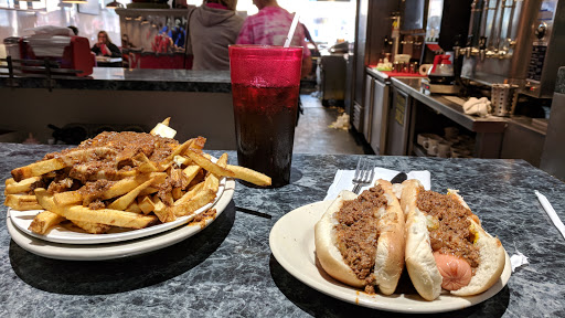 A pretty nice looking old school lunch spot for dogs burgers n fries but the golden aged patrons were a red flag warning of the bland food.
