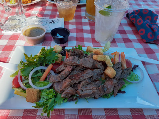 Vacation Roadhouse gem. Laid back and noisy. Half the people were in bathing suits. And the BIG surprise is the food. Really good.