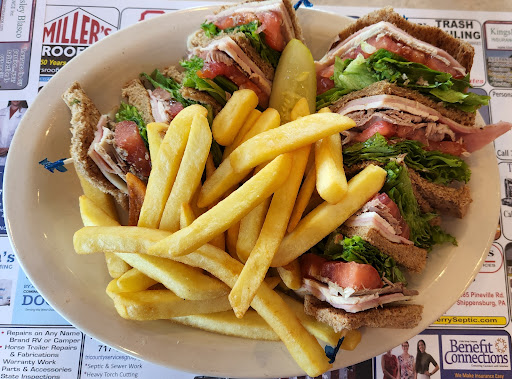 We had hamberger and chicken caesar wrap. They came with french fries with tiny cup of coleslaw. They were delicious. We also had fried egg with hashed brown which was nicely done. The place was clean and I noticed that the waitress swept the floor too after customer left their table. The service was fast and the waitress paid good attention to us . They were plenty of parking space. We would recommend this place to others.