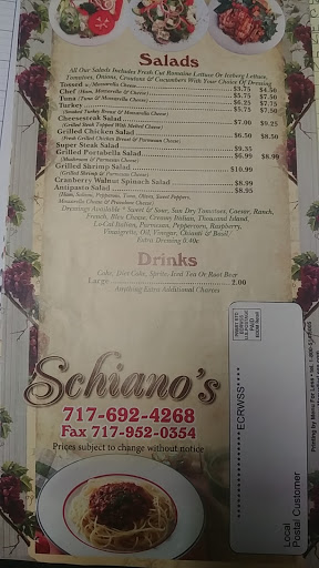 The food is always good and plentiful! Their toasted hot turkey subs are to die for. When you eat a sub there, there is plenty of meat in it. It isnt all lettuce. If my husband and I want a delicious sub, Schianos is were we go! The fries are good too and plentiful! The waitresses are always friendly and efficient also! The resturant is always clean. We go to the Millersburg location.
