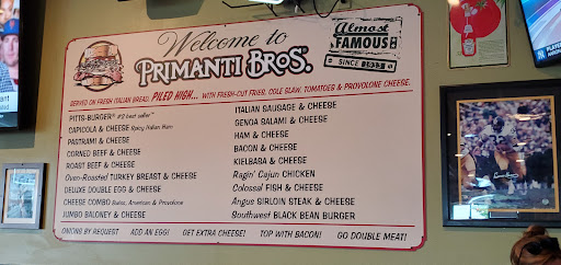 I was in the Pittsburgh area on business and in need of a dinner option the first evening in town. I checked with the front desk and they recommended Primanti Bros. I was unaware that Primatis was a Pittsburgh legend, but Im glad I stopped in! The first time I visited, I had the pizza. It was pretty good, but I was later informed by several locals that this was not a good choice-- I needed to get the Primanti Bros. "Pitts-Burger" sandwich. So, I headed back a second time during my visit and I was very impressed! The Pitts-Burger is considered the #2 best seller at the restaurant; if you want a good laugh, ask them whats #1! As an added bonus, there are plenty of TVs showing just about any sporting event being broadcast at that time. While thats not unique to Primantis is is a nice feature, especially when the Penguins or the Steelers are playing. The next time Im back in the Pittsburgh area, Ill definitely stop in at Primantis!
