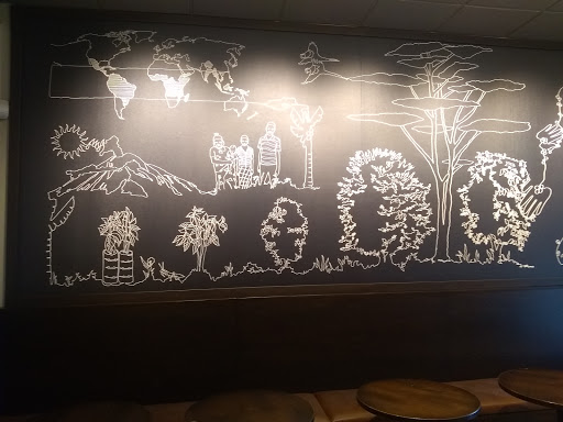 Remodeled @2015, this busy store is one of the best looking Starbucks around here. Its set up in hallway style, with a long series of tall, 2-top tables along the L/H wall and a cozy seating area invisibly sequestered behind merchandising displays to your right, when entering the store. A clever layout, overall, tho it forces people awaiting orders to violate the personal space of anybody at the 3 rearmost tables. Also, even with no drive-through this store is noisy -- a constant din of background sounds from machines, people, etc. Perhaps thats why some of the associates often get my order wrong. Or maybe its the time they spend animatedly chatting with friends & other staffers (and ex-staffers).